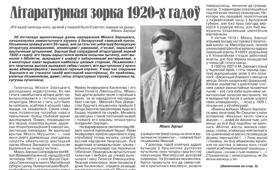 Імя Міхася Зарэцкага доўгі час было забыта, а між тым яго літаратурны талент заслугоўвае ўвагі шырокага кола чытачоў-беларусаў. Пра лёс і літартурную спадчыну пісьменніка распавядае Максім Гальпяровіч.